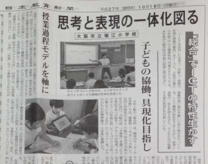 10月19日付けの日本教育新聞に、本校の公開授業で取り組んだ内容が掲載されました。ICTの特色を生かし、思考と表現の一体化を図りながら、子どもたちの協働する姿の具現化を目指した実践事例について紹介されました。