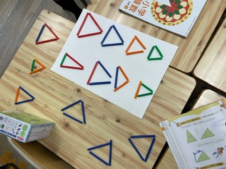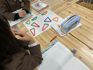 図形の学習をしています。辺の長さに着目して、グループで協力しながら仲間分けにチャレンジです。
