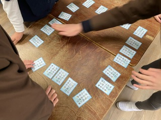 4年生では、国語科で百人一首の学習をしています。4人グループでの対戦。たくさん取れるかな。