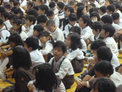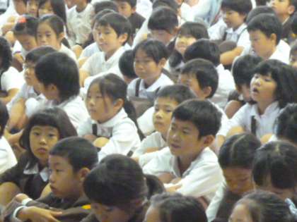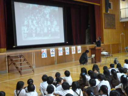 もうすぐ創立記念日なので、今日の集会は地域の方のお話を聞いたり、