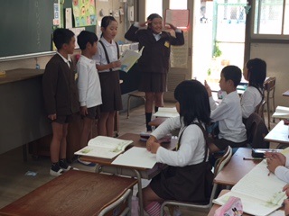 グループで考えた動作をつけて、音読していました。