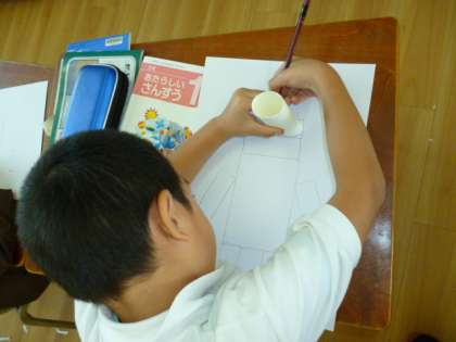 算数科「かたちあそび」でかたちをかきうつして絵を書いています。それぞれのかたちの特徴をいかして上手にうつして絵を書いています。