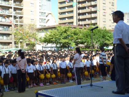 今朝の朝礼で、校長先生から毎朝、地域の人や先生に元気にあいさつしているのをPTA役員さんが褒めてくださったことを報告しました。