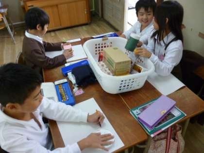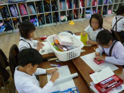 「かたちあそび」の学習の終わりに、集めた箱や缶を使って絵をかきました。箱を立てたり、横に寝かしたりしながら楽しい形を工夫してかきました。学習の終わりに、どれを使ってかいた絵かを発表し合いました。