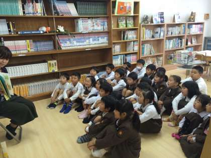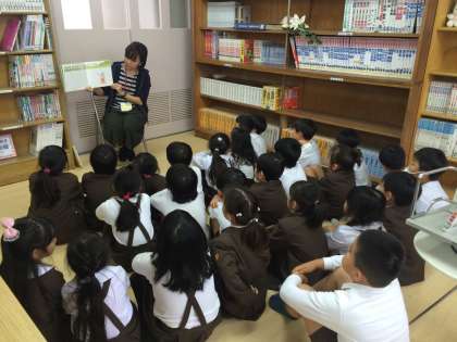 今日図書の時間に、火曜日に来られている学校図書館補助員の方に読み聞かせをしていただきました。