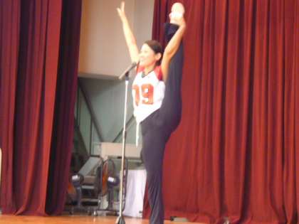 もとNFL Tampa Bay Buccaneers のチームキャプテンの小島智子さんにチアリーディングを教えてもらいました。子どもたちは、初めは少し緊張した様子で動きが良くなかったけど、次第に体が動くようになり、最後はいっぱしのチアリーダーの気分。