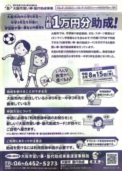 申請期限が夏休み中の8月15日(木)必着ですので、添付ファイルをご確認いただき、ご希望の方は大阪市習い事・塾代助成事業運営事務局までご連絡ください。