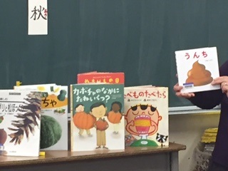 お話を聞いたり、絵本を読んでもらったりしました。秋に関係する本もたくさん紹介していました。