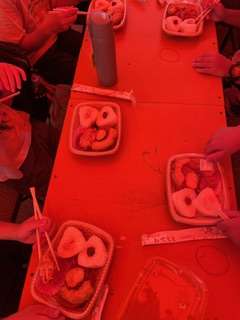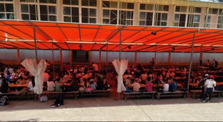 お昼ご飯は、おにぎり弁当です。登山後の空腹時に食べるお弁当は格別でした。子どもたちは、あっという間にたいらげました。テントの下で、お弁当の色が…