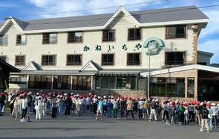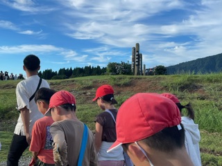 2日目の朝のつどい。子どもたちが考えたオリジナル体操で、しっかり身体と頭を起こしました。モニュメントまで朝の散歩。学級ごとに写真撮影後、朝食に向かいます。