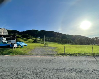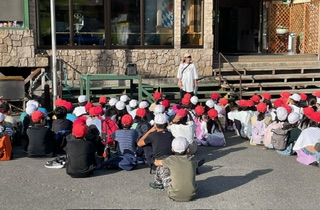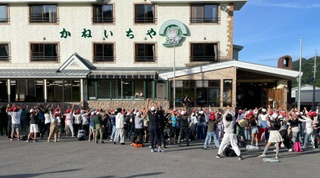 林間学習3日目の朝のつどい。今日もいい天気です。オリジナル体操で眠気を吹き飛ばし、最終日も元気にがんばろう。