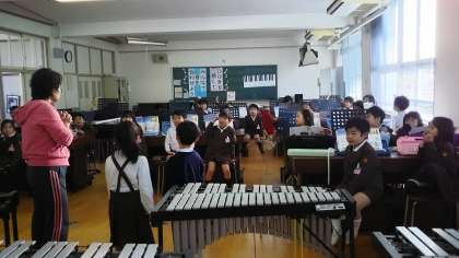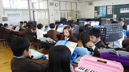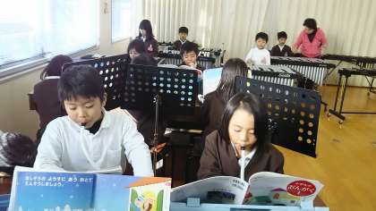 今日の音楽は、1年生はなかなか来ることのできない音楽室で学習しました。音楽室にある鉄琴をひきました。きれいな音色に「星か光ってる音みたい。」「高い音だから響いてくる。」と大喜びでした。