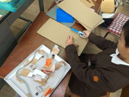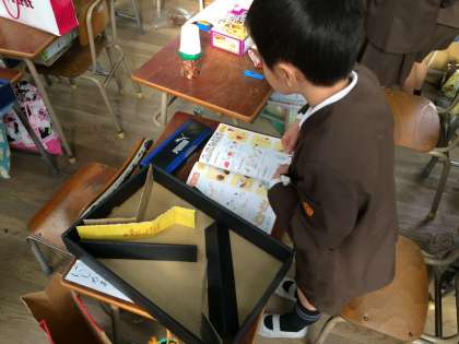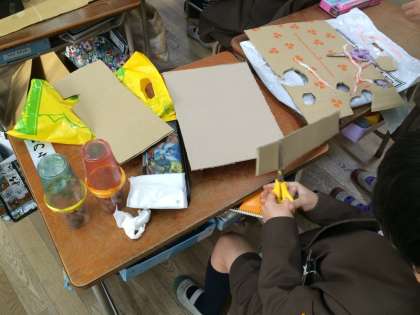 生活科の学習では「あきのおもちゃをつくろう」に取り組んでいます。みんな自分で材料をそろえて、秋のものを使ったおもちゃ作りに挑戦しました。