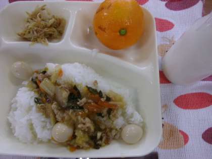 今日の献立は「中華丼、もやしの中華あえ、みかん、牛乳」でした。素早く盛り付け、さあ「いただきます!」