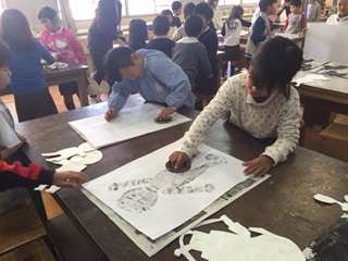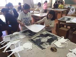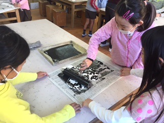 インクをつけてをしっかりつけて、班の友だちと協力して慎重に紙を置き、ばれんでしっかり刷りました。