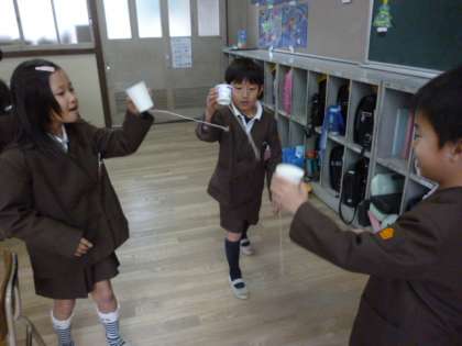 生活の学習で、公園でひろったどんぐりや木の葉を使っておもちゃを作りました。どんぐりけん玉、迷路、太鼓、マラカスなど楽しいおもちゃができました。友だちの作ったおもちゃでいっしょに遊びました。