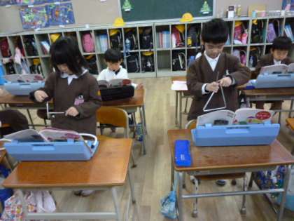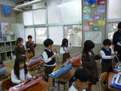 音楽の時間に鍵盤ハーモニカで「きらきらぼし」を練習しています。今日は、それに「トライアングル」を加えて演奏しました。持ち方、たたき方を確かめて、順番にたたきました。きれいな音色に 思わずうっとり。
