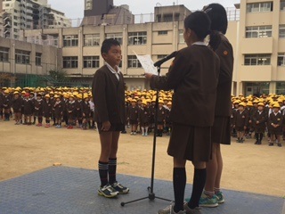 朝礼で大なわ大会の表彰を行いました。2年生の1位の記録は251回でした。