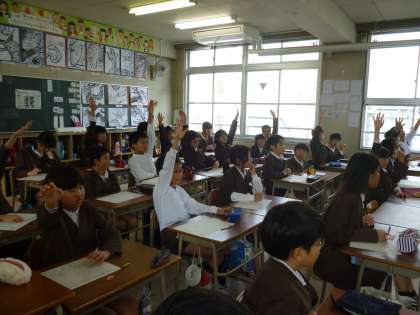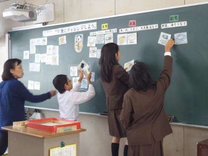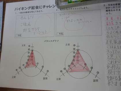 「バイキング給食にチャレンジしよう」自分で食べたいメニューを選び、献立を考えました。そのあと、主食・主菜・副菜の三種類に分類し、栄養のバランスについて考えました。