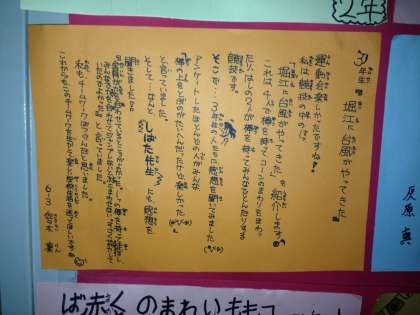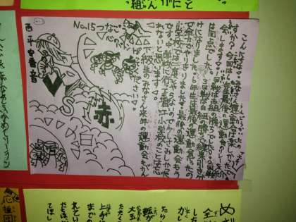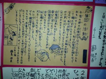 学校の廊下には、委員会の新聞がはられています。この前の運動会の記事です。今度の参観のときにでも、ぜひ、ご覧ください。職員室の近くにはっています。みんな、じょうずにかいています。