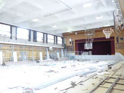 終業式は天井が高くなった講堂で行います。