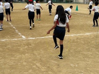 今日の体育は、インストラクターの方に、短なわのいろいろな跳び方のコツを教えていただきました。前跳びや後ろ跳び、あや跳びや二重跳びなど、アドバイスをもらいながら、子どもたちも一生懸命に、チャレンジしていました。これから、練習を重ねていって、できる跳び方を増やしてほしいです。