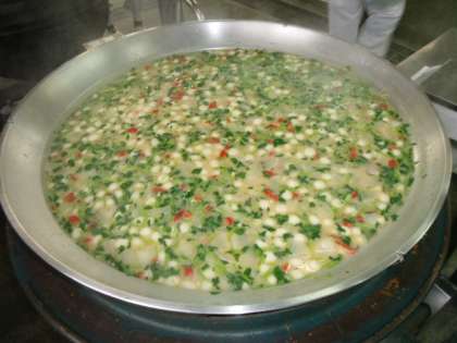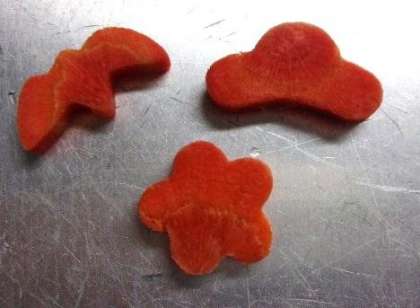 今日の献立は「さけちらし、ぞう煮、れんこんのごまじょうゆ焼き、牛乳」でした。この献立は、正月の行事献立です。「さけちらし」は、紅ざけフレークの赤い色がお祝いらしさをかもしだしていました。「ぞう煮」には、東住吉区でとれたなにわの伝統野菜の一つ金時にんじんを、松、竹、梅にくりぬいたラッキーにんじんが入っていました。白みそ仕立ての関西風で、みつばの緑色が鮮やかな仕上がりでした。穴が開いていることから、「将来の見通しがつき縁起がよい」とされているれんこんは、ごまじょうゆ味をつけて、焼き物機で焼きました。