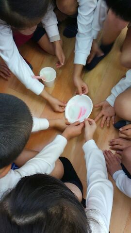 1つ目は、カット綿で自分の手を拭いて、手の汚れを調べる実験、2つ目は紙皿に赤インクを塗ったものを、手と手の汚れに見立て、その上に石けんの泡をのせると、どのような変化が表れるかを調べる実験を行いました。