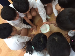 二測定の前に保健の先生たちから、手洗いについて二つの実験をしました。