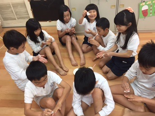 二つ目の実験は、自分の手を脱脂綿で拭いてみました。綺麗に見えていた手に汚れがいっぱいついているということに驚いていました。