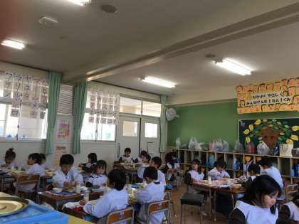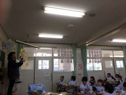 配膳の様子を見て下さったり、牛乳を飲むことはとても大事だという紙芝居を読み聞かせしてくださったり、一緒に給食を食べてくださったりしています。