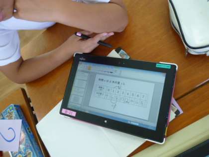 単元は、算数の「2つの量の変わり方を調べよう」で、本時は比例の特徴を理解することです。電子黒板、タブレット端末、デジタル教科書を使って勉強しました。