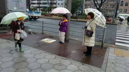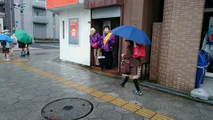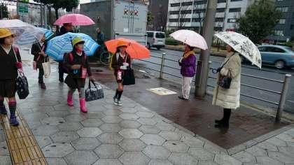 冷たい雨の中、堀江連合 女性会の方が登校時の見守りを行ってくださいました。
