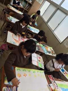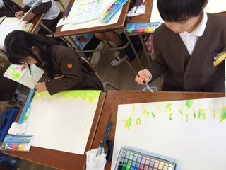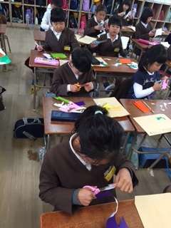 今日は、折り紙を切ったり、画用紙に背景を描いたりしました。