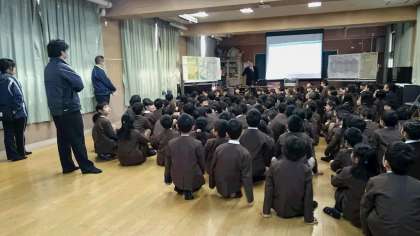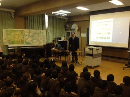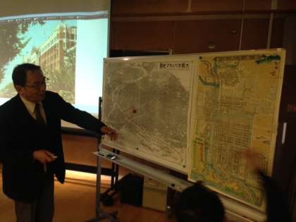 川村会長が、堀江の歴史と会長の幼い頃の体験の話を当時の写真や昔の地図から説明してくださいました。