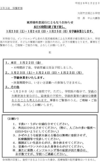 ・1月26日(火)は登校です。ただし、学校医の指示で、学級の欠席状況を見ながら給食後の下校や、学級休業等の適切な措置をとることも考えられます。