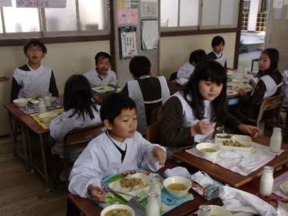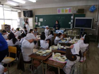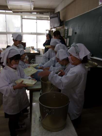 1月25日〜29日まで、堀江小学校の給食週間です。今朝の児童集会では、各クラスの代表が、感謝の気持ちを綴ったメッセージを、給食調理員さんに渡しました。給食時間には異学年での交流給食をしました。1年生の教室には、4年生の児童が来ていました。配膳を4年生が手伝ってくれました。ちょっと緊張しながら、楽しくお話をしながら食べることができました。