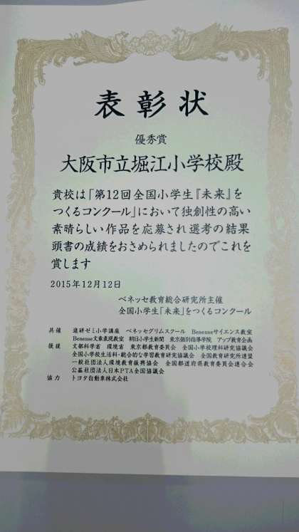 ・表彰状紹介:「第12回全国小学生『未来』をつくるコンクール」で本校から340名 の児童が応募したところ優秀賞をいただきました。