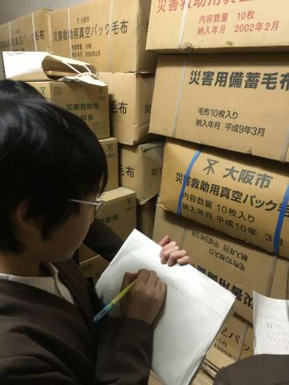 防災学習の中で学校の備蓄倉庫にはどんなものがどれだけあるのかグループで調べに行きました。