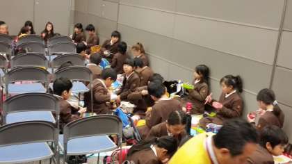江戸時代の体験後、昔の道具について説明を受けたホールでお弁当を食べました。どの子どもたちも笑顔たっぷりでご飯を食べていました。