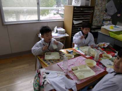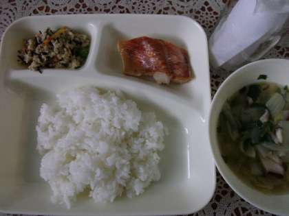 魚が苦手な子は半分にしましたが、食べてみるとおいしい味つけで食べやすく、残っていた魚もみんなで食べてしまいました。高野どうふのいり煮も、ごはんによく合う味つけで、ごはんと一緒にパクパク食べることができました。