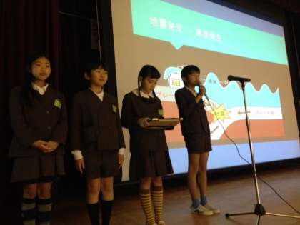 4年生の子どもたちは、自助(自分の命は自分で守る)をテーマに調べ・考えたことを自分たちことばで発表していました。