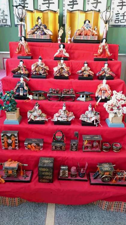 東校舎2階の廊下の北側突き当りに「ひな人形」を飾りました。