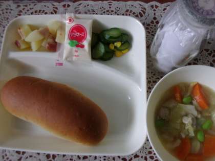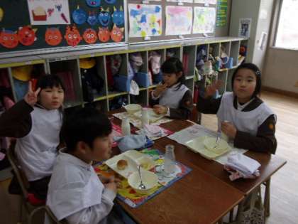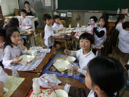 もうすぐ3年生になる2年生は、残さずしっかり食べています。グループで楽しくおしゃべりをしながら、みんなニコニコ顔の給食時間でした。