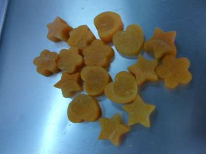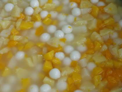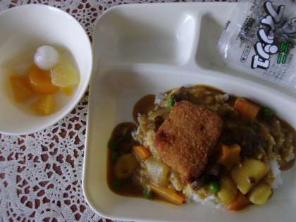今日は、入学祝い献立の「カツカレーライス、フルーツ白玉、ミニフィッシュ、牛乳」でした。1年生のみなさん、ご入学おめでとうございます。みなさんが1年生になったお祝いの献立でした。カレーライスには、ハートや星や花形のラッキーにんじんが、堀江小学校全体で100個入っていました。ラッキーにんじんが入っていましたか。デザートには、彩りのきれいなフルーツ白玉がついていました。