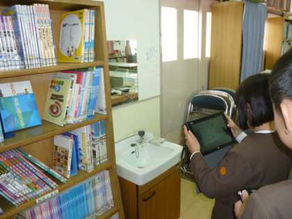 社会科「人々のくらしと飲み水」の学習で、校内の蛇口の数を調べてまわりました。タブレットで撮影し、数を確認していきます。