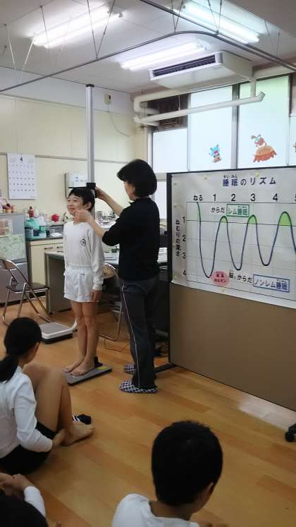 4年生になって初めての発育測定の日。養護教諭の山本先生からの講話は「眠りの大切さについて」でした。そのあと、身長・体重を測ってもらい、とてもうれしそうでした。