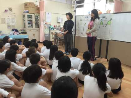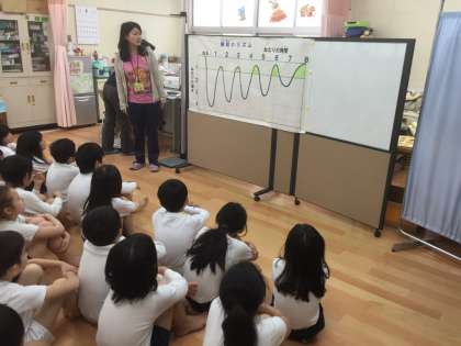 測定の前に、睡眠のお話を聞きました。睡眠って、みんなの成長にとってすごく大切な事が分かりました。3年生の3学期から、どれくらい成長したのか、みんなワクワクしながら測定結果を聞いていました。