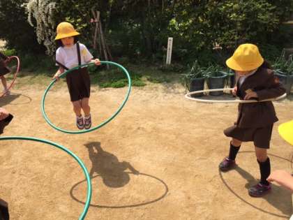 昼休みの休み時間。フラフープで遊んでいる2年生です。みんなとても上手にできていました。