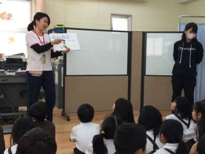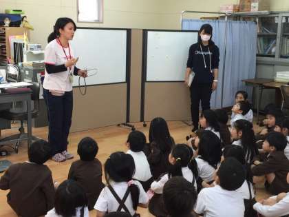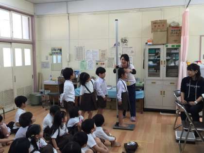 小学校においてある健康診断に使う道具を見て「痛いかな〜」「怖いな〜」と言っている児童に安心してもらえるように、使い方の説明や、診てもらう時のポイント等をお話ました。